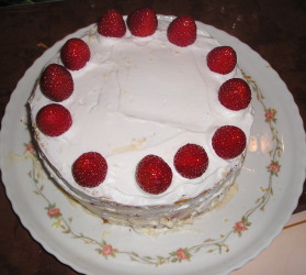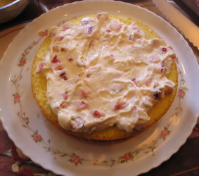 【9】内鍋にサランラップを敷いてスポンジ、【8】のクリーム。スポンジと合わせ冷蔵庫で冷やし硬め、あとでTOPを飾る。。 |