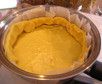 中フライパンに、底にクッキングシートを敷き、タルト生地をのばし、貼り付け、フォークで底に穴を開けておく。