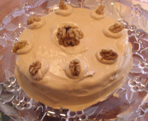【4】焼き上がったら、2枚にカットしモカクリームを塗り、仕上げにクルミを飾る。