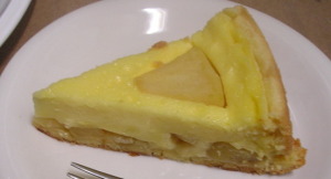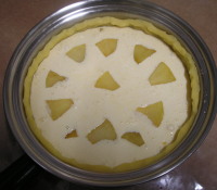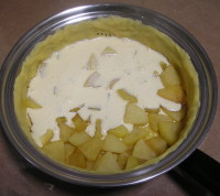 【4】【2】のタルトの中に、リンゴを入れ、そこに、【3】のクリームを流し込む。(飾り用のリンゴを少しとっておく)