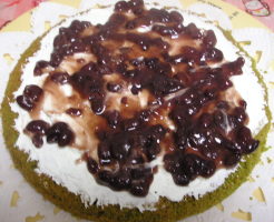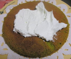 【6】三枚に切ったスポンジの底の部分をひっくり返して生クリームあずきをのせて