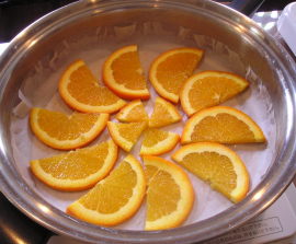 【1】大フライパンにクッキングシートを敷き側面にバターを塗って、底にオレンジの輪切りを並べておく。