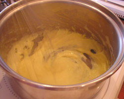 【3】先ほどの、中フライパンに流し込み 電磁調理器ケーキモード弱で。