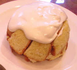 【9】【4】に【8】、イチゴ、【8】の順に入れ残しておいたスポンジでふたをし、冷蔵庫でしばらく固める。出してから生クリームを絞り出し飾る。