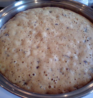 【6】【5】を【1】に流し込みケーキモードで焼く。焼き上がったら網にとりだしクッキングシートをはずしブランデーをぬる。
