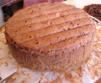 【1】スポンジを焼く。できあがれば冷ましてスポンジを3枚に切っておく