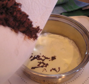 | 【3】鍋に生クリームを入れ火にかけ煮立ったら火を止め刻んだチョコを入れ手早く混ぜチョコレートクリームを作る |