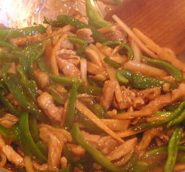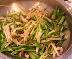 【1】クィーン・ウォックを熱し、肉を入れてフタをする。火が通ったら肉をほぐし、ピーマン、タケノコ、Aを加えフタをする。