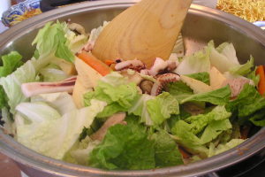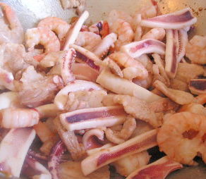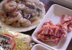 残った油を拭き取り材料を炒め、Aを加えBでとろみをつけ麺にかける。