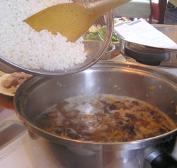 【2】Bに戻し汁と、たして2Cにして【1】に入れ、沸騰したらもち米を入れ、木べらで混ぜながら水分を完全にすわせる。