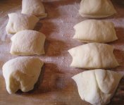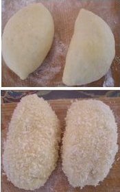 【4】【3】の生地が倍になったらガス抜きをし、よくこねて16〜20等分にする具を詰めて牛乳をくぐらせ、パン粉をつけて、揚げる。 |