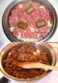 【2】(C)の玉ねぎをメタルでみじん切り、中フライパンに敷く。ジャガイモをシュレッダーにかけ、玉ねぎの上へ。さらにその上にひき肉を置いて、塩胡椒しカレールーをおいて火にかけておく。 |