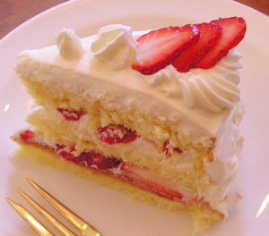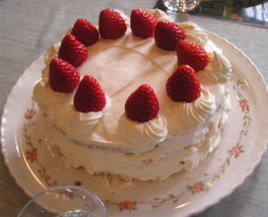 【5】スポンジの側面にナイフを入れ3枚にし、泡立てた生クリーム、カットした苺をのせそれをくり返し、今回は、カットしてから、TOPをかざる。 |