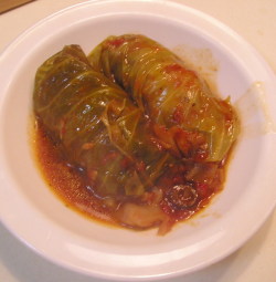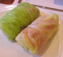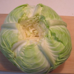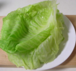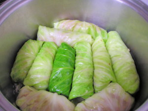 【1】ソースパンに1センチの水を入れ、その中に丸ごと、芯をくり抜いたキャベツを入れ無水で、1枚ずつはがしながらゆでていく。(硬い部分はみじん切り)