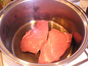 【1】シチュー鍋を温めて肉を焼く。