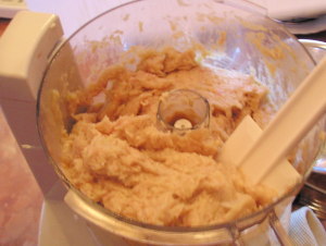 【2】FPで卵3個と砂糖を加え泡立てる。(5分くらい)油を混ぜ、さらに粉をさっくり混ぜる【1】に流し込ケーキモードで焼く。
