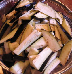 【1】なすは櫛形に切って水につけあくを抜き水分をよく拭き取っておく。