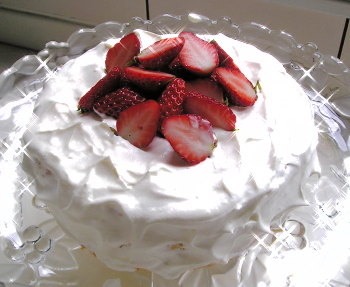 【3】3枚に、スライスしたスポンジの、底の部分をひっくり返し、皿に置き、クリームを塗り、苺を並べ、スポンジを置き、 同じように繰り返す。