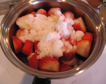 【4】(苺1パック・砂糖万能カップ1・ブランデー大さじ1 レモン汁少々)を中火にかけカタカタいえば