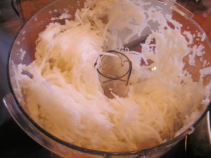 【2】FPで卵3個と砂糖を加え泡立てる。(5分くらい)油を混ぜ、さらに粉をさっくり混ぜる【1】に流し込む。