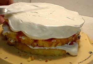 【5】スポンジ1枚目に生クリーム1/3をかけ苺ソー1/3をかけ繰り返す