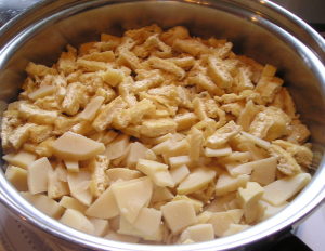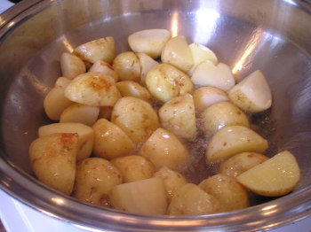 【2】ウォックに油を入れ新じゃがを10〜15分中火で揚げる。途中で2回くらいかき混ぜる。