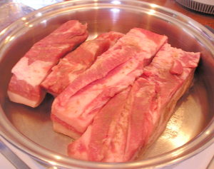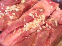 【2】ニンニクはみじん切り、肉に強めの塩コショウをする