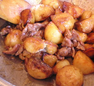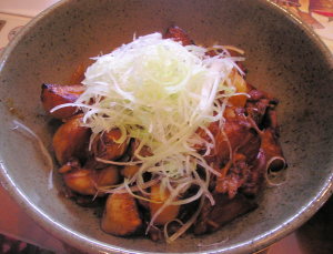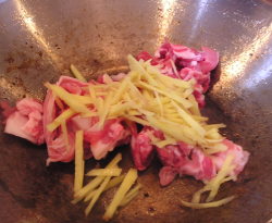【4】ウォックに生姜と大きめに切った豚肉を入れ色よく炒める。揚げたジャガイモ、Aを加え、さらにバター3分の2を加えとろみが出るまで中火で炒め煮する。