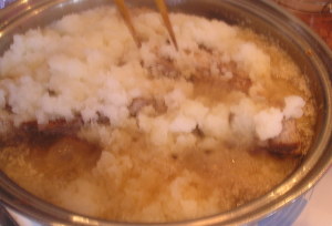 ガスの場合は、中火。沸騰すればとろ火にして14分ぐらい。10分蒸らす。