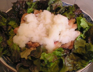 【5】肉に火が通ったらスライスして大根おろし(上半分)とポン酢をかけていただく。