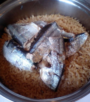 【1】大ソースパンに米を入れ、水、しょうゆ、酒を入れサンマも入れフタをし中火にかける。カタカタ鳴ったら弱火に落とし12分、蒸らしに10分。