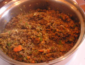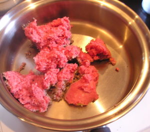 【1】フライパンを温め牛肉ミンチを入れ蓋をし加熱を止め15秒くらい待つ。(肉が鍋にこびりつかない)