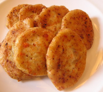 【3】【2】を一口大の団子にして170度の油でカラッと揚げる。