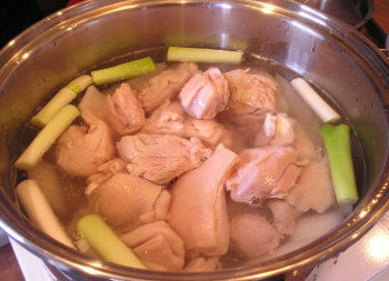 【2】次に【1】の鍋で鶏をさっとボイルする。 →ザルに揚げる
