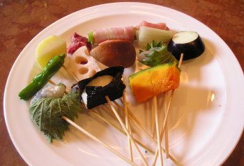 アスパラ。なす。ししとう。豚串。 車海老。里芋。たまねぎ。にんにく。鶏ササミしそ巻き。しいたけ。レンコン。 他こういったものも良し。 角もち
