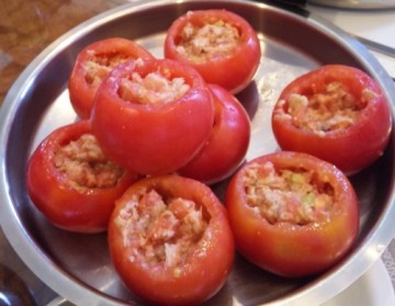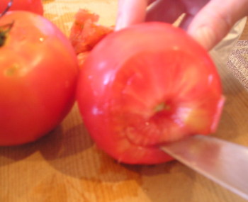 【1】トマトは上部だけを切り取り中身をくり抜く。切り取った部分は皮をむきくり抜いた中身は種を取って粗く刻む。