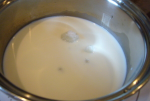 【2】中ソースパンで牛乳を沸騰しない程度に温め、砂糖を入れて泡立て器などでよく混ぜる。