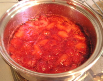 【4】(苺1パック・砂糖万能カップ1・ブランデー大さじ1・レモン汁少々)を中火にかけカタカタいえば