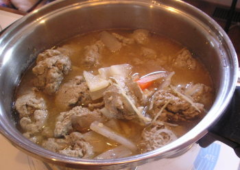 【2】(A)と水を入れ炊き材料が煮えたら、【1】をスプーンですくって入れて煮、味付けをする。