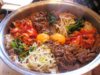 【5】焼き色が付いたら具をのせタレをウォックのふちから回しかけ卵黄を入れIR10でにかける。