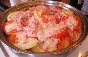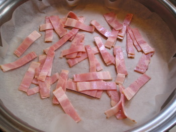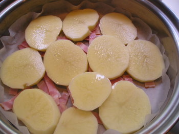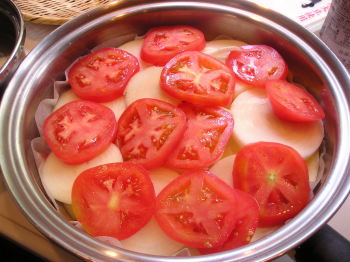 【2】フライパンにクッキングシートを敷き、ベーコン、ジャガイモ、タマネギ、トマトの順に重ね塩コショウオレガノをふりもう一度繰り返す最後にベーコンをのせる。