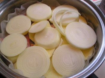 【1】タマネギ、じゃがいも、トマトを5ミリくらいの輪切りにしてジャガイモは水にさらす。ベーコンは3センチくらいに切る