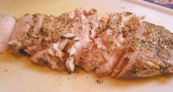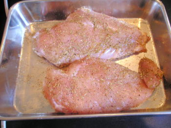 【1】鶏胸肉(皮なし)にハーブミックスと塩をまぶし10分くらいおいとく。