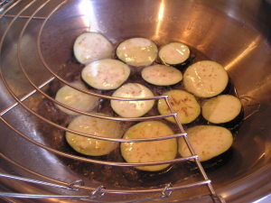 【2】茄子を素揚げし、漬け汁に漬ける。