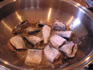 【3】サンマに片栗粉をまぶし揚げて、【2】に、漬け込む。