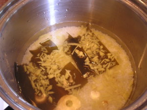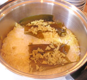 (1) 鍋に[合わせだし汁]に米を浸しておいたところに、千切りにした新生姜を入れ、炊く。