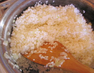 さらに米を加え、弱火で透き通るまで炒める。