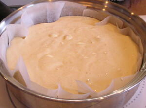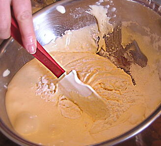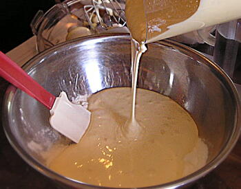 【2】 中ボウルに強力粉をふるい入れ、粉の上に【2】を流し入れてサックリ混ぜ合わせる。