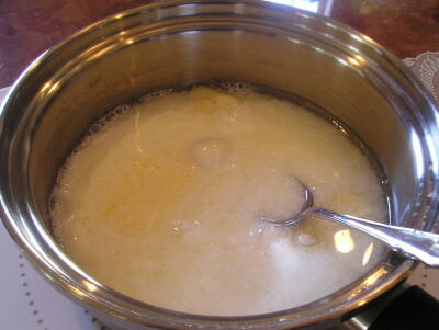 【1】小ソースパンでホワイトソースの材料を入れ電磁調理器火力5で、とろみがでるまで混ぜる