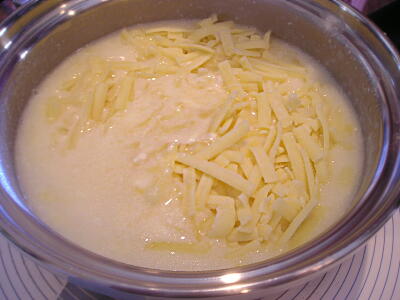 【2】チーズを細かく刻んで小ボーに入れ【1】を加える。